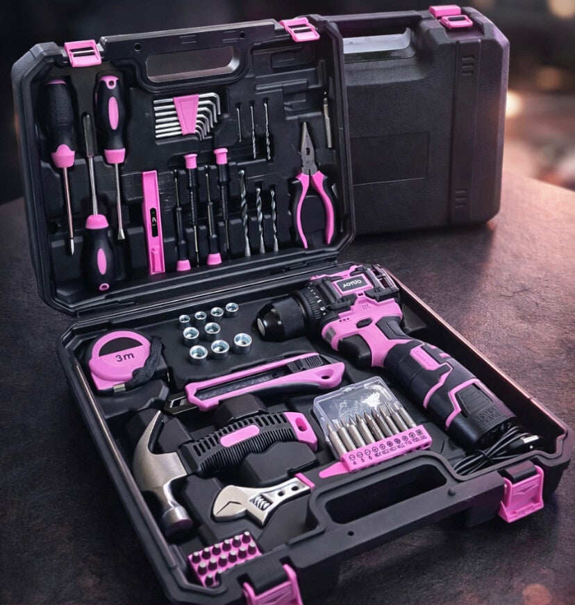 Complete gereedschapsset met 126 onderdelen, inclusief roze snoerloze boormachine (8 V) en diverse handgereedschappen zoals bitset, meetlint, hamer, schroevendraaiers en meer. Perfect voor doe‑het‑zelf projecten, klussen in huis of als cadeau. Stoere, vrolijke set in opvallende roze kleur — ideaal voor beginners en hobbyklussers.